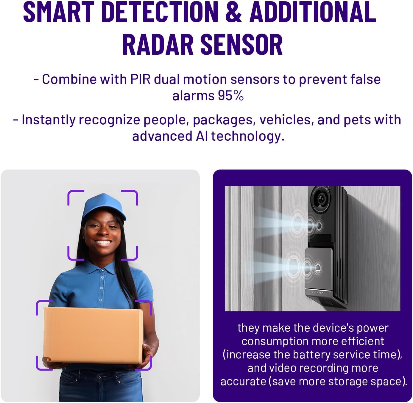 【YOUR CONNECTED DOORMAN】Instantly recognize people, packages, vehicles, and pets with advanced AI technology. Plus exrta radar sensor, with PIR combination dual motion sensors to greatly prevent false alarms. Reduce false alarm happened by 95% through double motion detection. APP real time alerts to ensure you won’t miss any incident.