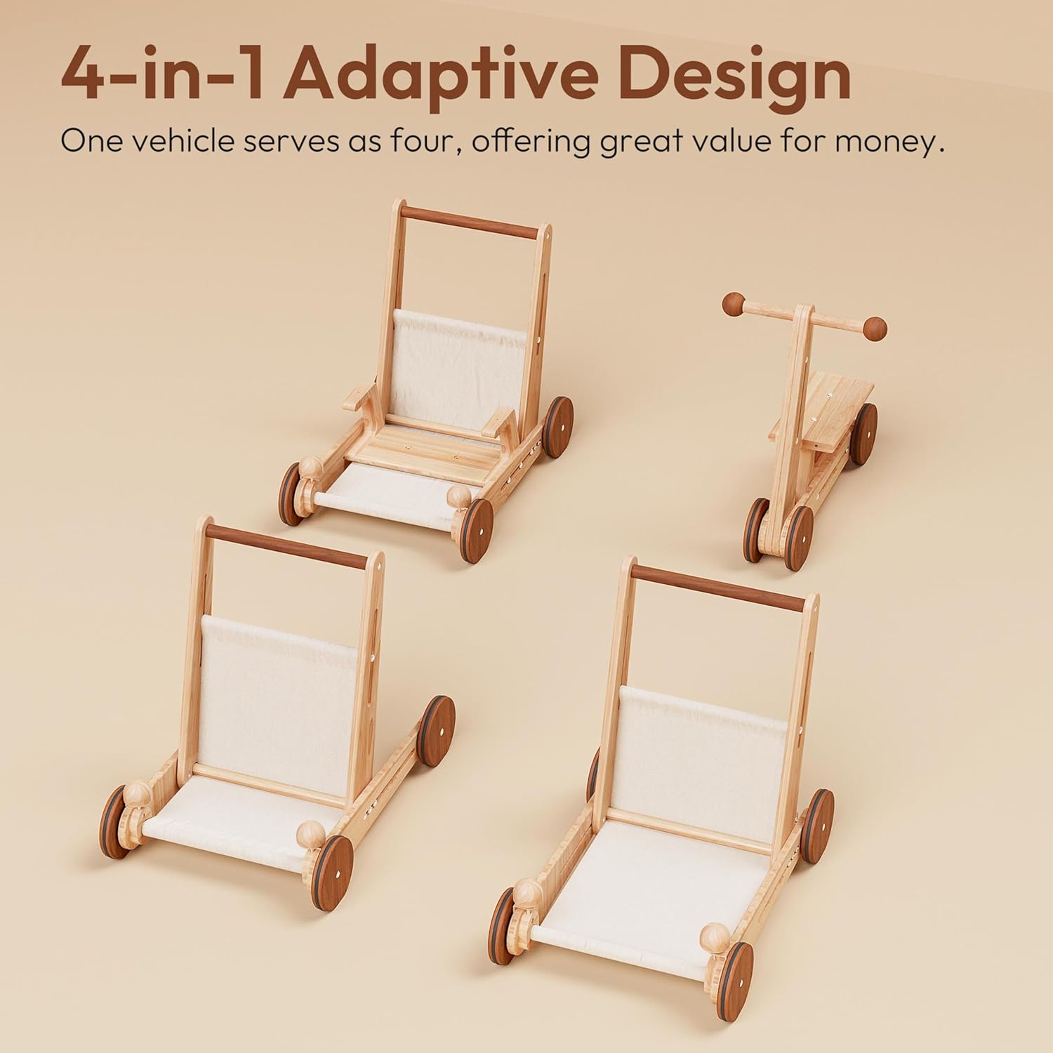 Versatile 4-in-1 Design: Inspired by Montessori principles, this wood walker offers multiple functions. It serves as a traditional baby walker, a push wagon for carrying toys, and even transforms into a wooden balance bike, promoting your child’s motor skills development and independence, adapting to your baby’s every growth stage.