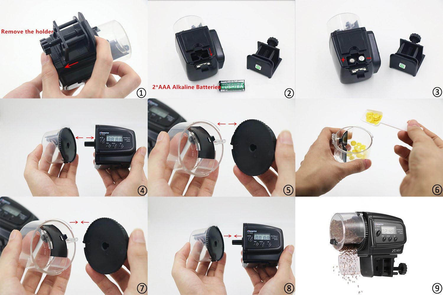 🐠【Multi-funtional】: Remember to set up for rotation times, otherwise the feeder won’t work! 2*AAA batteries included, can last for 3 months. Feeds all kinds of fish foods, including flakes, pellets, powders and strips. Ideal for home fish tanks and aquariums. Can feed most of pet fishes, turtles, newts and frogs.
