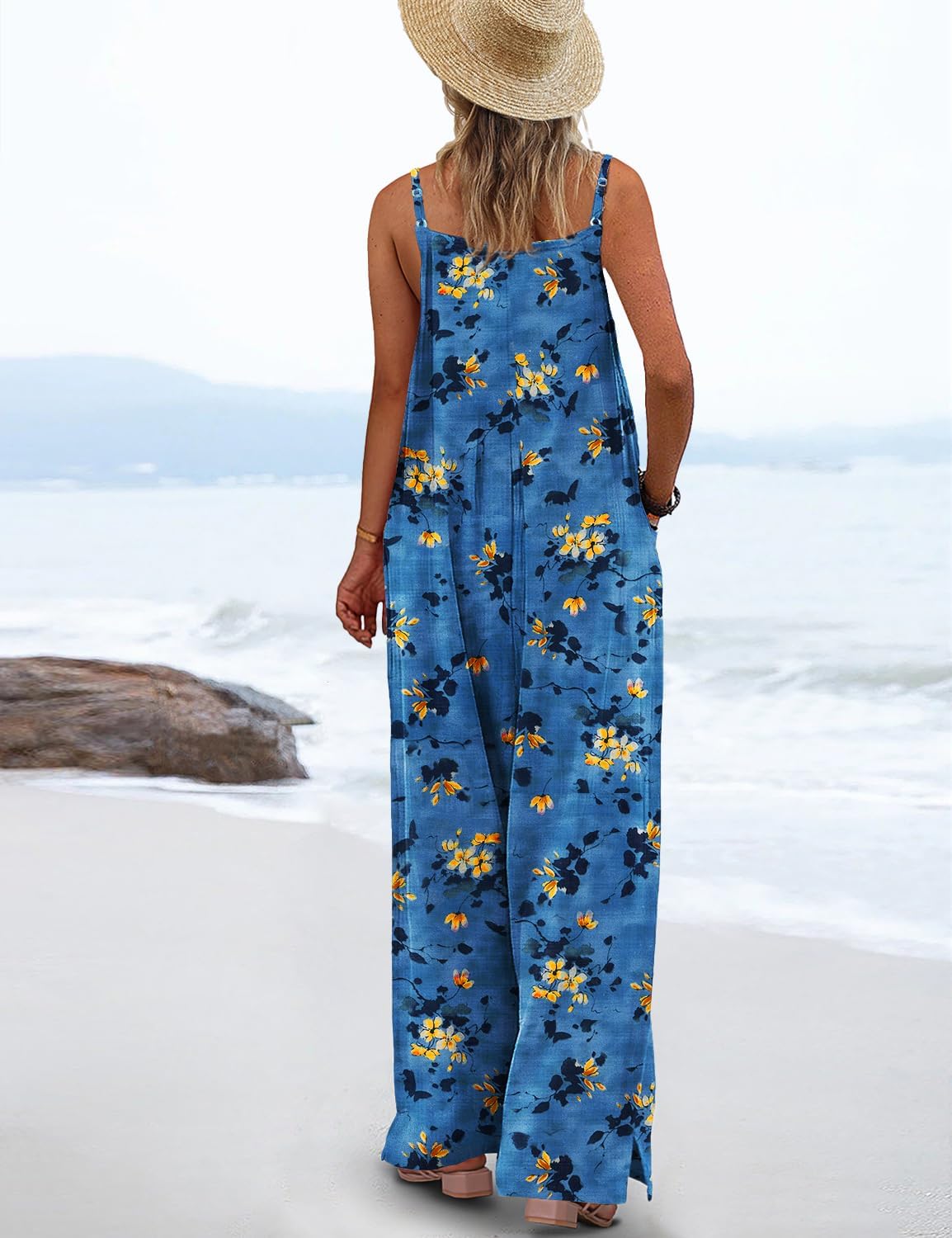 The adjustable spaghetti straps and elastic under the arms ensure a snug and secure fit.Two convenient pockets are perfect for keeping your essentials close at hand.Side split wide legs can not only highlight your femininity, but also flatter your leg shape.