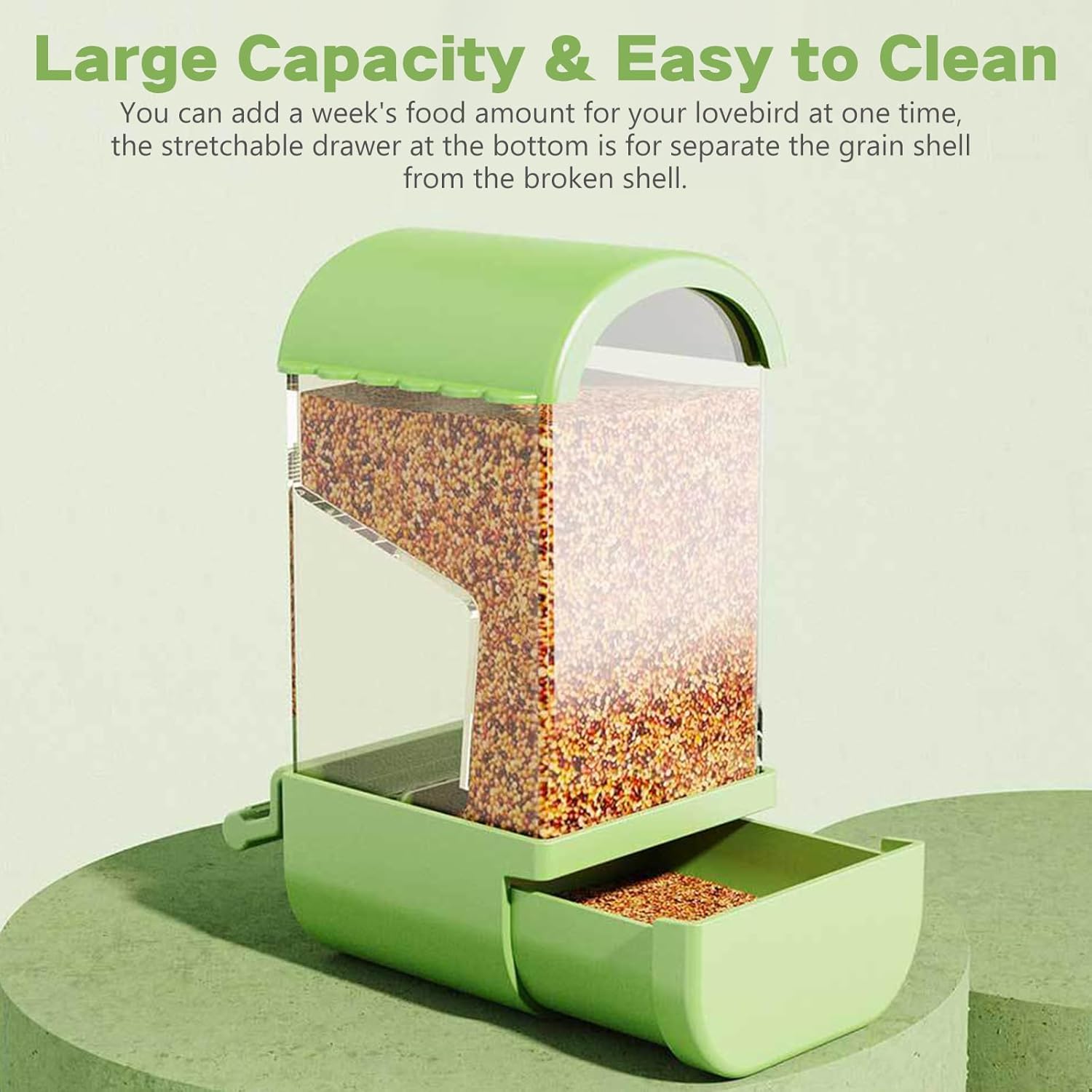 【Premium Material & Easy to Clean】: Made of durable acrylic, long lasting and easy to clean. The transparent design is convenient for you to see the remaining state of the food and replenish the food in time.There is a retractable drawer on the bottom of the automatic bird feeder, it can store the the broken grain shell to avoid the mess of bird cage.
