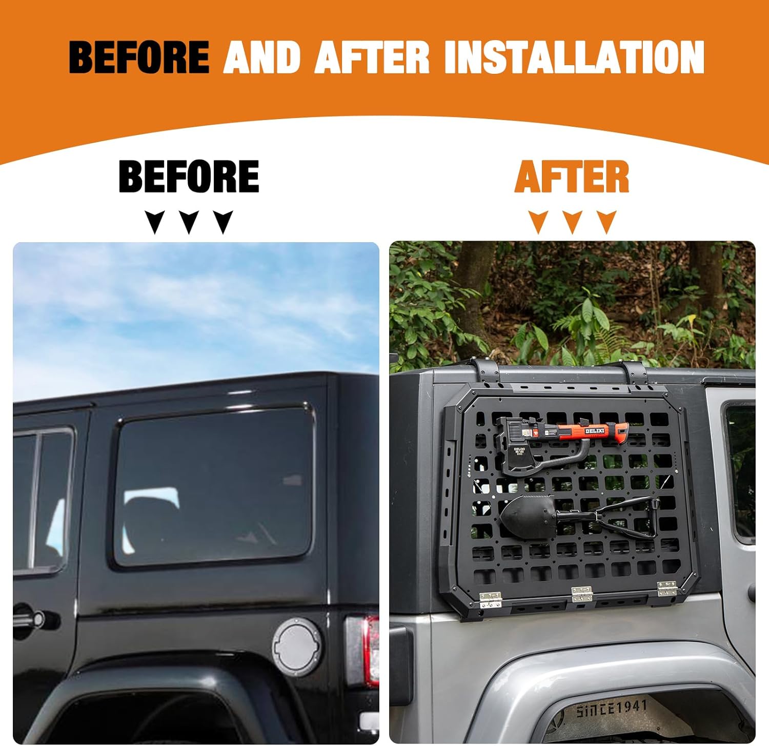 HEAVY-DUTY BUILD WITH INCREASED THICKNESS – Constructed with a reinforced 0.19-inch thick aluminum panel, this molle system is strong enough to support heavy off-road gear and tools.It fully covers the rear window, combining rugged functionality with a sleek, practical design.